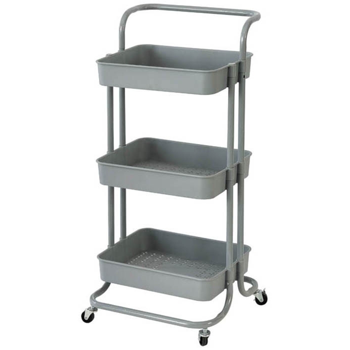 Μανάβης τρόλλεϋ μεταλλικός Click Σε ασημί/γκρι χρώμα Με 3 πλαστικά καλάθια με διάτρητο σχέδιο και μεταλλικό σκελετό Ιδανικό για να αποθηκεύσετε φρούτα και λαχανικά Διαθέτει ροδάκια για εύκολη μεταφορά Διαστάσεις: 48x33x66εκ. Το προϊόν αποστέλλεται ασυναρμολόγητο. ..