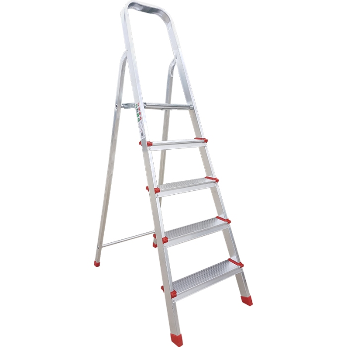 Σκάλα κατασκευασμένη εξ ολοκλήρου από αλουμίνιο. 5 σκαλοπάτια και 1 πλατύσκαλο Σκαλοπάτια φάρδους 7 εκ. Αντιολισθητικά πέλματα Ύψος (μέχρι το πλατύσκαλο) : 116 εκ.Ύψος (μέχρι τη λαβή): 178εκ. Εύκολη μεταφορά με βάρος μόλις 4,4 kgΜέγιστο βάρος 150kg Κατασκευάζεται στην Ελλάδα ..