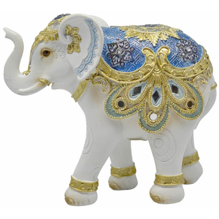 Φιγούρα διακοσμητική Ankor Με σχέδιο ελέφαντα Σε λευκό χρώμα Με χρυσές και μπλε λεπτομέρειες Με έθνικ σχέδιο Υλικό: πολυεστέρας Διαστάσεις: 14x5.5x11εκ. ..