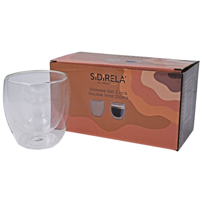Ποτήρια διπλού τοιχώματος σετ 2 τεμαχίων γυάλινα διάφανο 250cc Sidirela E-4587