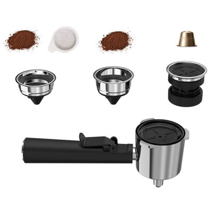 Ισχύς: 850W Τύπος καφέ: Αλεσμένος-Μερίδα-Κάψουλα τύπου Nespresso 2 φλυτζάνια καφέ (αλεσμένος) Πίεση: 20bar Υψηλής ποιότητας Ιταλική αντλία πίεσης Εύχρηστη έγχρωμη οθόνη αφής με 3 διαφορετικούς τύπους καφέ και επιλογή αφρογάλατος Ψηφιακή οθόνη αντίστροφης μέτρησης χρόνου προετοιμασίας καφέ και ένδειξης εσωτερικής θερμοκρασίας Διακόπτης ρύθμισης ατμού Ταυτόχρονη ροή καφέ σε 2 φλυτζάνια Αποσπώμενο δοχείο νερού χωρητικότητας 1.7Lt Βαλβίδα ασφαλείας Ανοξείδωτα φίλτρα για αλεσμένο καφέ και μερίδας ESE..