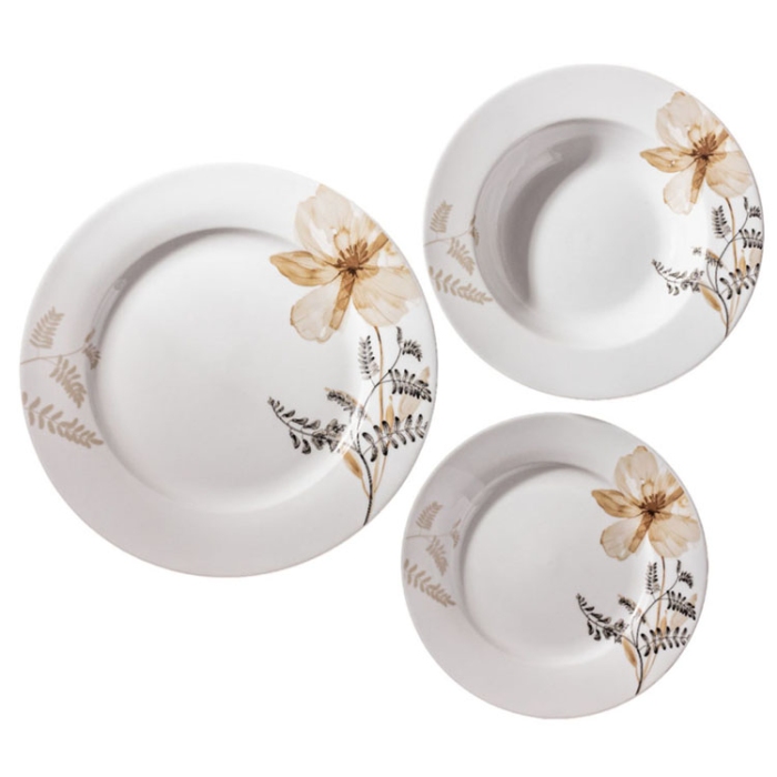 Πιάτα πορσελάνης σετ 18 τεμαχίων Λουλούδι λευκό-μπεζ Ankor R2617-18