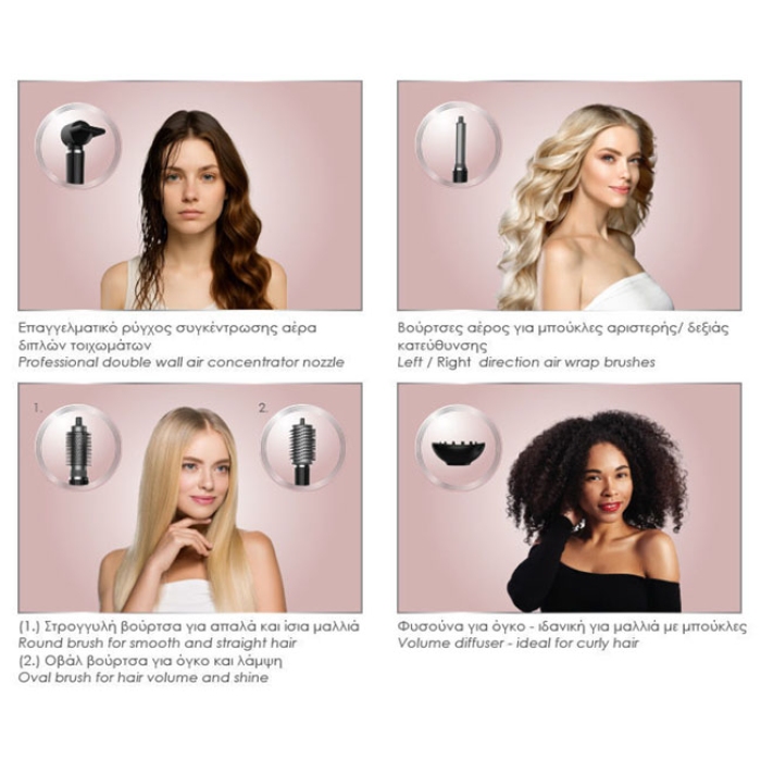 Ισχύς: 1500W Επαγγελματικό μοτέρ BLDC με μεγάλη διάρκεια ζωής και επαγγελματικών επιδόσεων Ταχύτητα αέρα 110.000RPM Πολύ ελαφρύ στο κράτημα 3 επιλογές θερμοκρασίας Cold, Warm, Hot 3 επιλογές ταχύτητας Έξυπνος έλεγχος θερμοκρασίας NTC smart control 5 εξαρτήματα: Στενό στόμιο για styling Κυλινδρικά στόμια 2 κατευθύνσεων για ιδανικό φορμάρισμα και μπούκλες με την τεχνολογία COANDA Βούρτσα για styling και ίσιωμα Επιλογή κρύου αέρα Μακρύ καλώδιο 1.8m ..