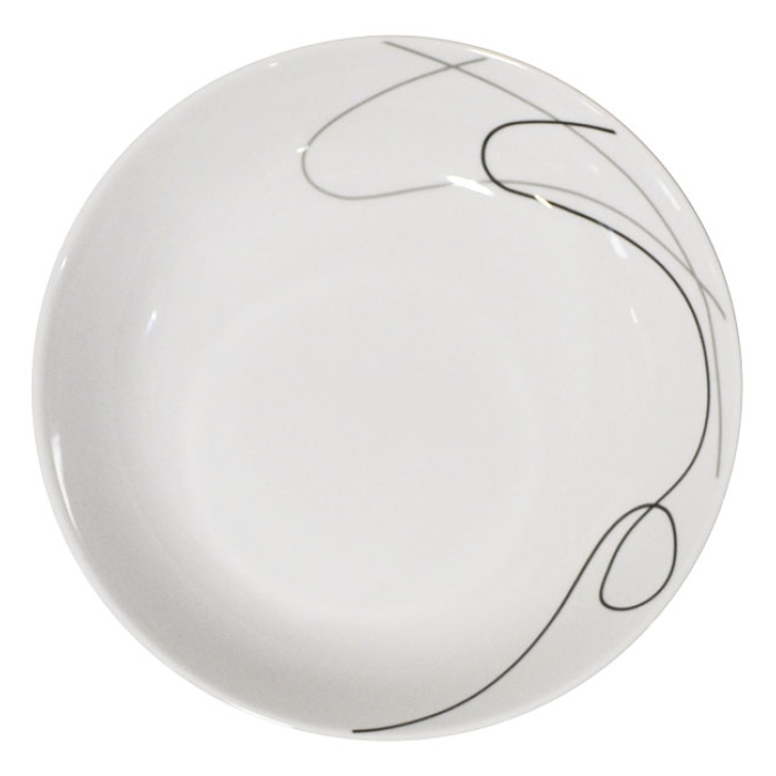 Πιάτο ρηχό πορσελάνης Karvounis Σε λευκό/μαύρο/γκρι χρώμα Διακόσμηση με καμπυλωτές γραμμές Διαστάσεις: 27x3εκ. Ασφαλής χρήση σε πλυντήριο πιάτων και φούρνο μικροκυμάτων. ..